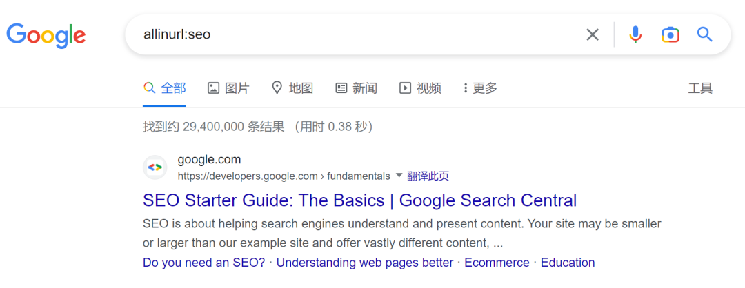 使用链接查询语法“allinurl:”能够帮助我们查找到url链接中包含目标关键词的页面。比如,我们想要查找url链接里包含“seo”的页面。输入搜索指令:allinurl:seo