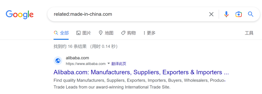 可以看到搜索结果中,包含了SEO的strategy、techniques、tips等近似词结果。搜索指令符“related:”可以帮助我们查找到与目标网站内容近似的其他相关站点。比如,我们想要查找与中国制造网网站相似的其他站点。输入搜索指令:related:made-in-china.com