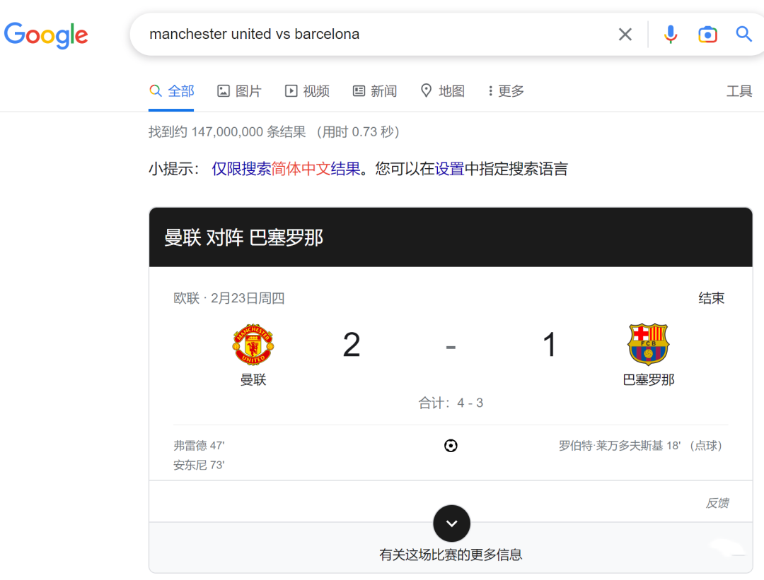如果你是一个体育赛事的爱好者,使用谷歌搜索能够帮助你轻松掌握喜爱的队伍的比赛情况。在谷歌搜索框中输入你喜爱的队伍名称,或者输入彼此竞争的两个队伍名称,谷歌会告诉你相关的赛程和队伍得分情况。比如,我们想要知道曼联对阵巴塞罗那的比赛情况。输入搜索指令:manchester united vs barcelona