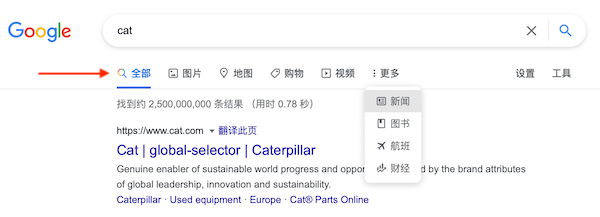 在谷歌搜索结果页面的最上方部分,我们可以看到有很多个标签。利用它们,我们可以指定搜索范围,获取更加精确的结果。