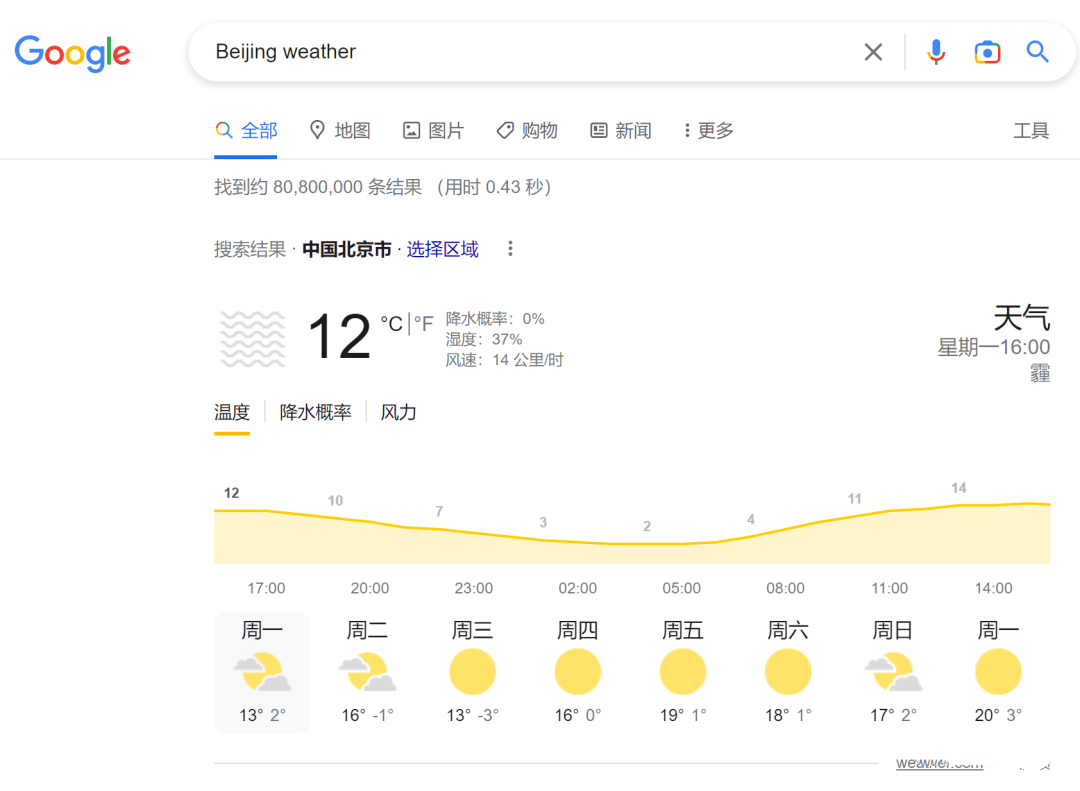 如果你想要了解某个特定地区的天气情况,直接在Google里搜索“地区名称+weather”,谷歌会给你当地天气的实时状况反馈。比如,我想知道近期北京的天气情况。输入搜索指令:Beijing weather