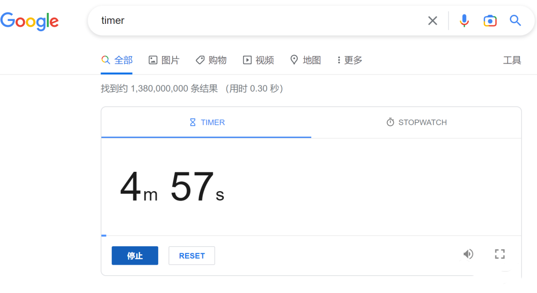 Timer命令允许你使用谷歌设置计时器。它对任何人来说都很简单,对各种情况都很有用,比如当你想参加模拟考试、在预先确定的时间内写一篇文章、或者为各种任务分配时间等。输入搜索指令:“timer”或“set timer”调出在线计时器,你可以在其中设置具体时间并启动它。