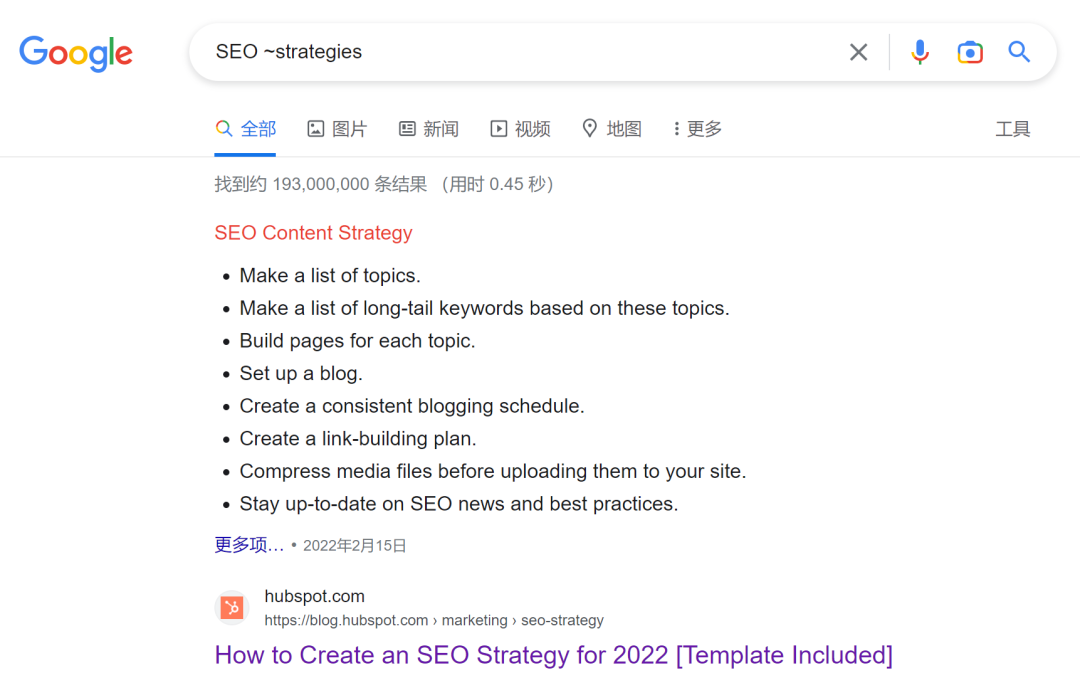 这个技巧是非常实用的,比如说你想在某个具体的学术网站上查找关于某方面的文章,或者外贸行业中搜索网站中的联系方式,都能用到。在各种语言中,都有一些词汇含有相同或者近似的意思。使用近似查询指令,我们可以获得目标关键词及其近似词的搜索结果。比如,我们想要查询SEO方面的策略或者教程。输入搜索指令:SEO ~strategies