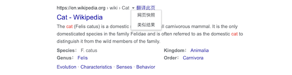 在每条搜索结果的Url地址旁边,我们可以看到有个小箭头,点击它即可发现快照查看按钮。