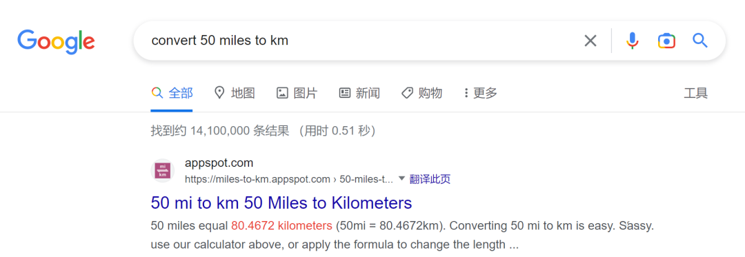 比如,我们想知道50英里等于多少千米。输入搜索指令:convert 50 miles to km