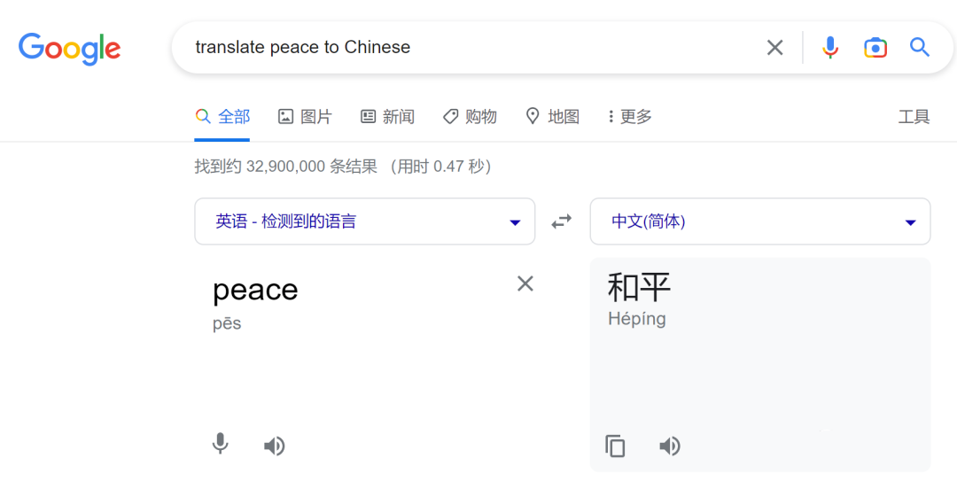 使用谷歌搜索某个词组的翻译版本,可以用到translate指令符,该搜索命令能够把目标文本翻译为你想要的其他语言。比如,我们想把Peace翻译为中文。输入搜索指令:translate peace to Chinese