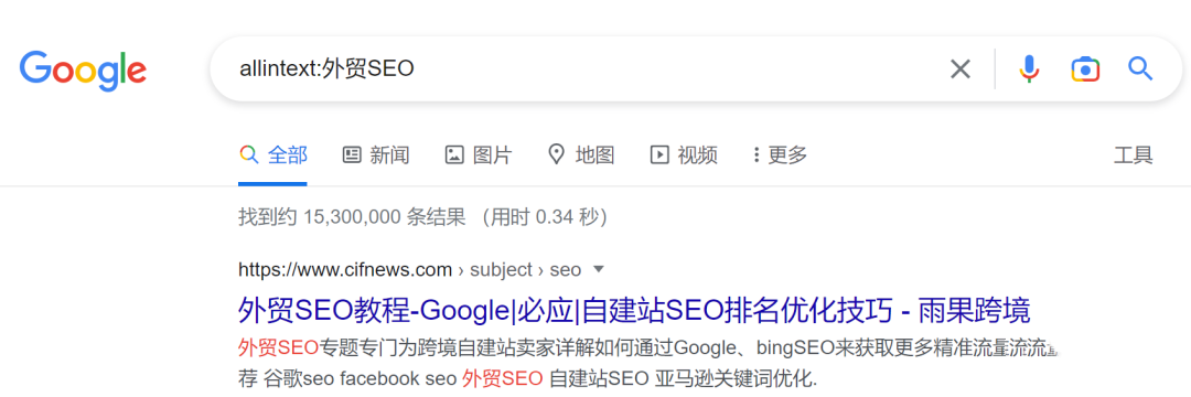 使用谷歌的“allintext:”搜索语法,可以帮助我们搜索正文中包含完整关键词的网页。如果去掉all只使用“intext:”,那么搜索来源将不限于页面正文部分,其标题、url链接等部分也会成为关键词来源。比如,我们想要查找正文中含有外贸SEO这个关键词的页面。输入搜索指令:allintext:外贸SEO