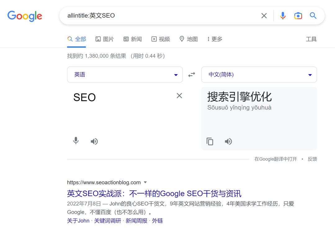本文中所指的标题,不是页面正文中显示的各类标题,而是一个页面的元标题,也就是搜索引擎结果中显示的页面标题。使用“allintitle:”搜索指令,可以帮助我们查找到标题中包含确切关键词组的页面。如果是单个词语,也可以去掉all,仅使用“intitle:”。比如,我们想要查找标题中包含英文SEO这个关键词的页面。输入搜索指令:allintitle:英文SEO