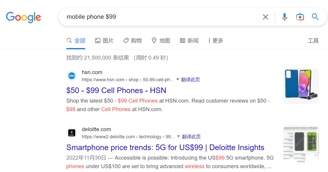 谷歌可以帮助你比较在线商店中的售价信息,使用“$”查找符合你预想价格的商品和店铺。比如,我们想要买一款售价在99美金的手机。输入搜索指令:mobile phone $99