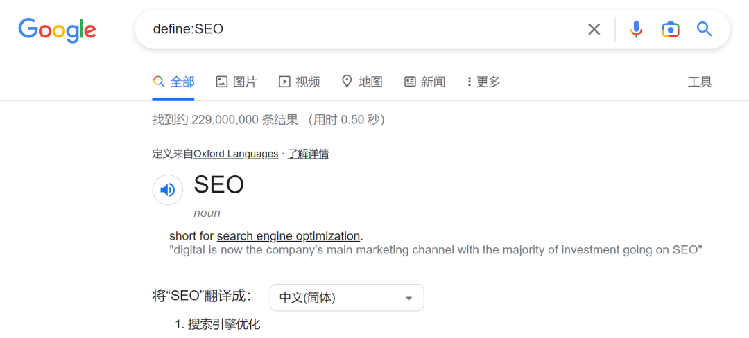 如果你想要知道某个词汇的定义,只需要在谷歌中使用“define:”搜索符,即可进行快速查询。谷歌会显示这个词汇的具体含义,并且你可以通过播放器知道这个词汇的具体发音。比如,我们想要知道SEO是什么意思。输入搜索指令:define:SEO