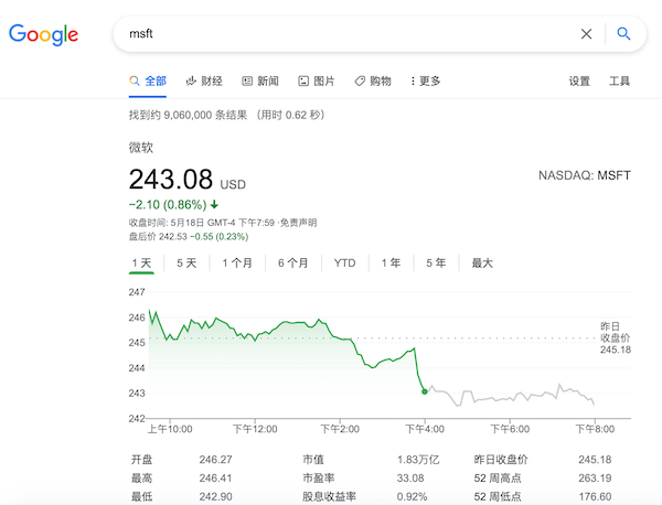 在谷歌搜索框中输入某个公司的股票代码,即可看到其具体信息。比如,我们想要了解微软公司的股票信息。输入搜索语法:msft(这个是微软的股票代码,如果你想要知道一个上市公司的股票代码,可以使用“公司名+stock”进行查询)