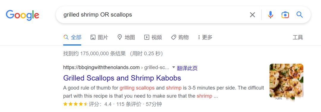 一般情况下,谷歌会搜索你输入的所有单词。通过使用OR指令,谷歌会知道它需要查找一组词或者另外一组词。OR必须全部大写,否则谷歌会认为它只是关键词中的一部分,而不会执行该搜索语法。比如,我们想找虾或者扇贝的烤制方法。输入搜索指令:grilled shrimp OR scallops