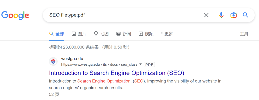如果你有大段的内容需要翻译,可以直接使用谷歌翻译,会更加地方便:https://translate.google.com/技巧15. 使用 Filetype: 查找特定格式的文件无论word也好、Excel也好,每种文件都有其特定的类型,如果你想要查找某个特定类型的文件,就可以使用“filetype:”搜索符。比如,我们想要找SEO相关的PDF文件。输入搜索指令:SEO filetype:pdf