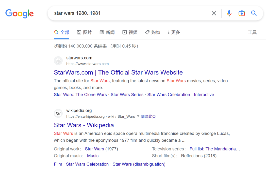 谷歌甚至拥有可以绘制诸如sin和cos之类的函数图形的先进计算器,还可以解决诸如半径为4的圆的面积之类的几何问题。你可以尝试在谷歌里搜索:cos(3x)^2 + sin(3x)^2我们可以使用谷歌查找特定范围内的某类信息,最常用的就是查找某个时间段内的信息。比如,我们想要查找1980年到1981年内的星球大战的相关信息。输入搜索指令:star wars 1980..1981(如果我们去掉1980,那么将查找1981年之前的所有相关信息)