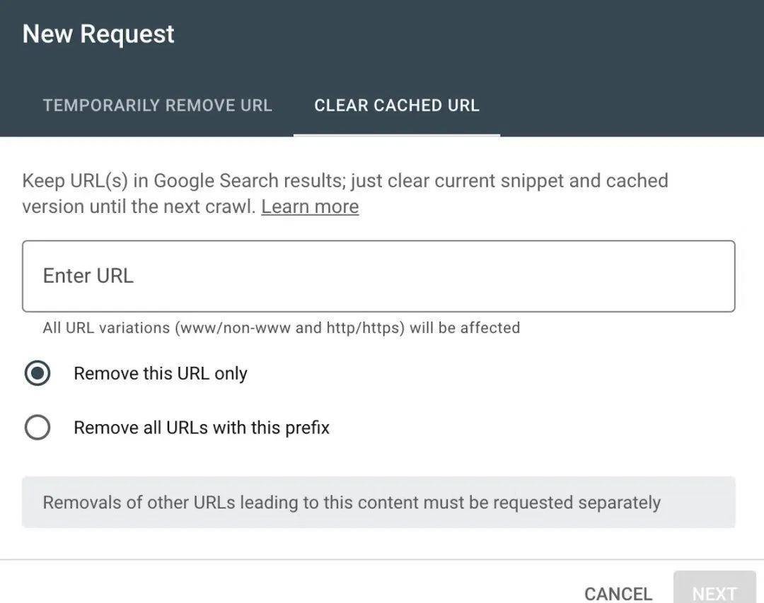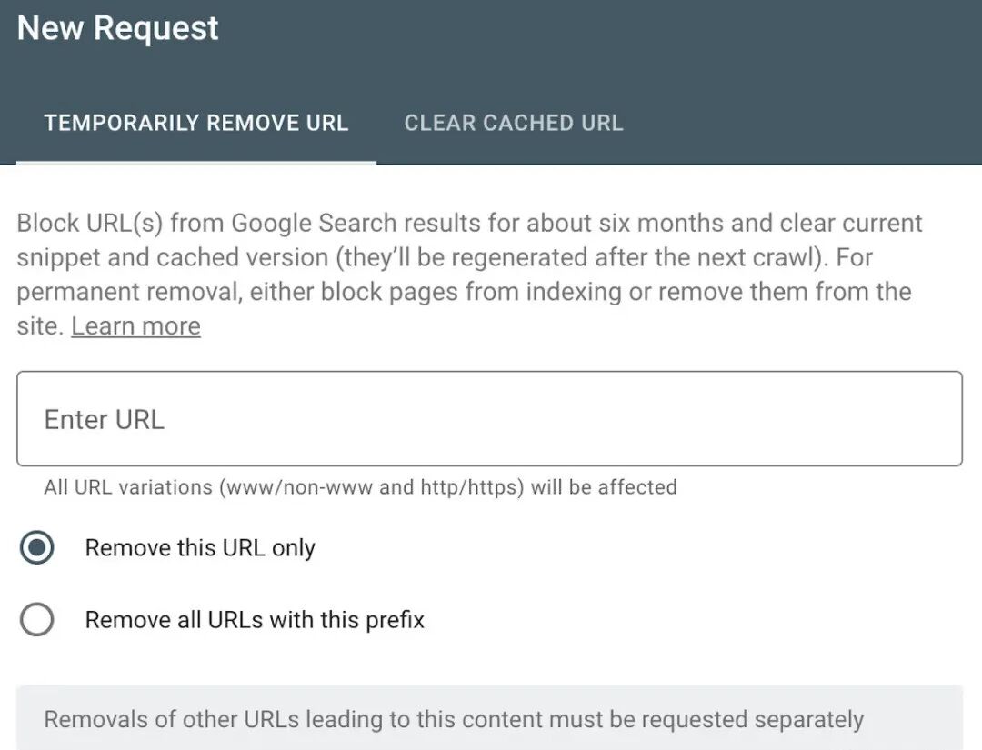 - 选择您希望 Google 仅删除一个 URL 的缓存,还是删除以特定前缀开头的所有 URL 的缓存。