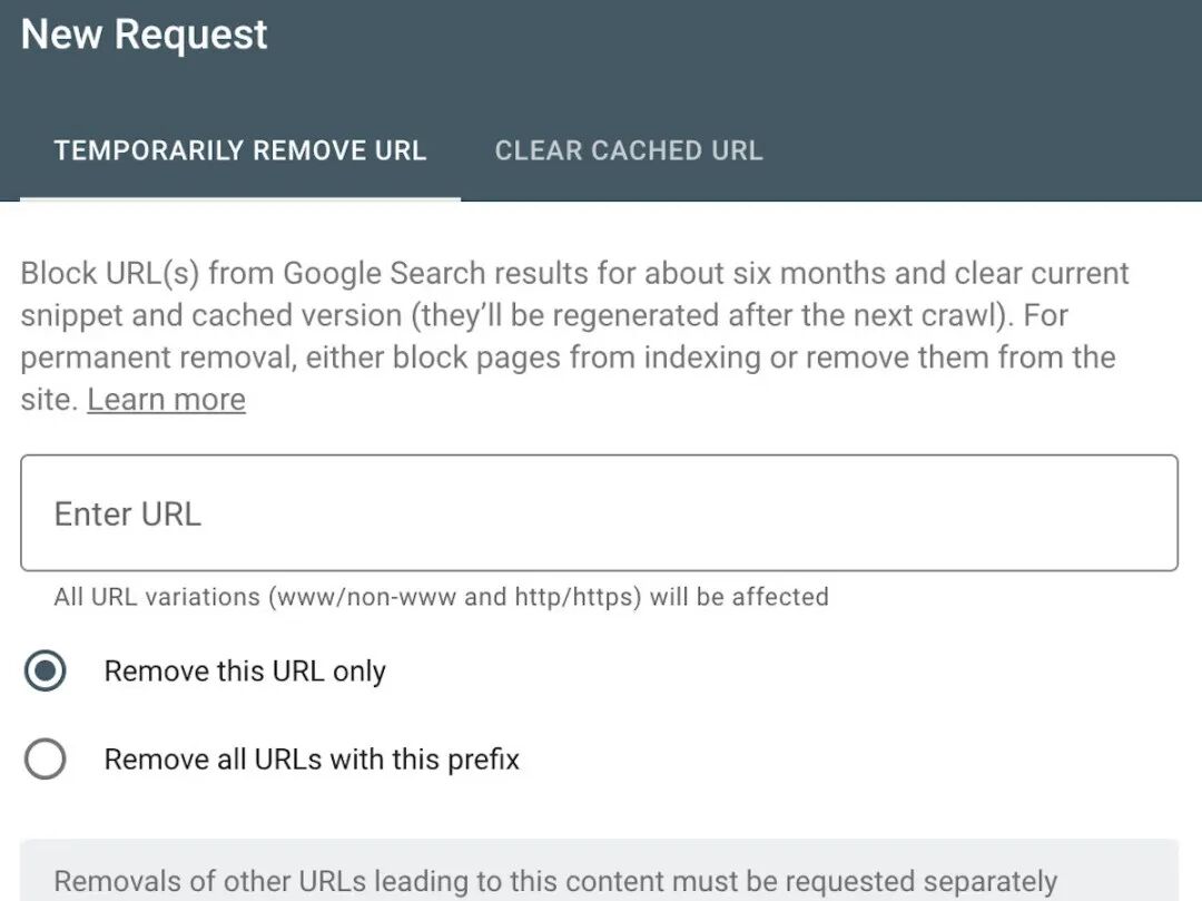 - 选择 ,输入要删除的 URL,然后点击按钮。Google 现在会将 URL 隐藏 180 天,但请记住,这些 URL 将保留在 Google 的索引中,因此您需要采取额外的措施来隐藏它们。
