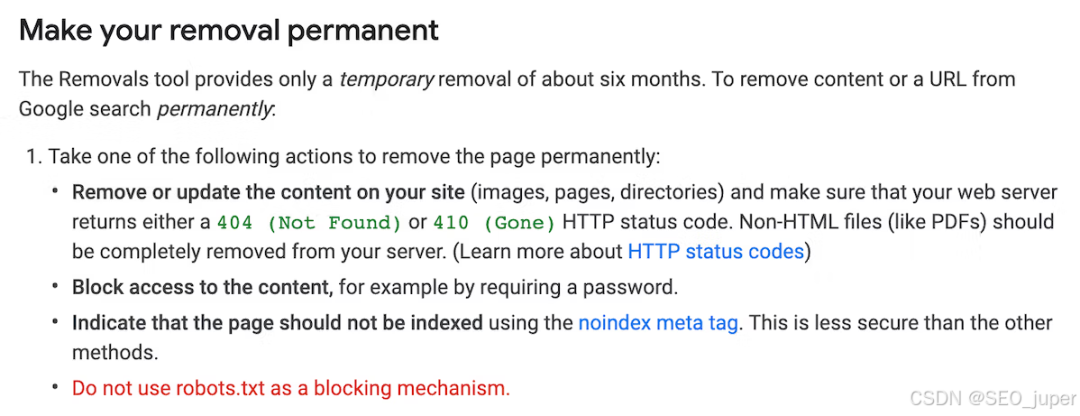 Google 的文档对此不是很清楚,因为如果你查看Removals Tool 文档你会在他们也讨论 HTML 和非 HTML 文件的部分中找到这一行:Do not use robots.txt as a blocking mechanism.