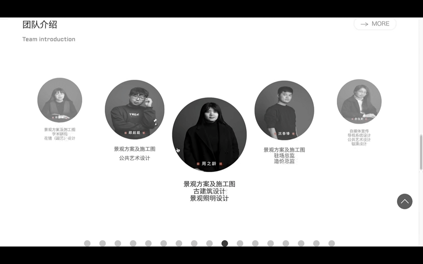 除了配色上的考究,“普济设计”官网在空间感上也有所处理。如首页企业介绍板块,组合色块加上浮字母让图片看起来更有纵深感;除却千篇一律的展示图规整排列,以图文交错的形式营造出立体感。这种空间感的进步一彰显,则是将字母设计打破网站模块安排的限制屹立在官网的团队板块,让空间感跃然而出。正如前人以“远观其势,近观其质”所总结出观赏山水画的诀窍,审视一个网站的设计好坏也是如此,必须从整体纵观,再到细看每个细节的设计。因此可以看出,“普济设计”官网对于两者都处理得非常出彩。