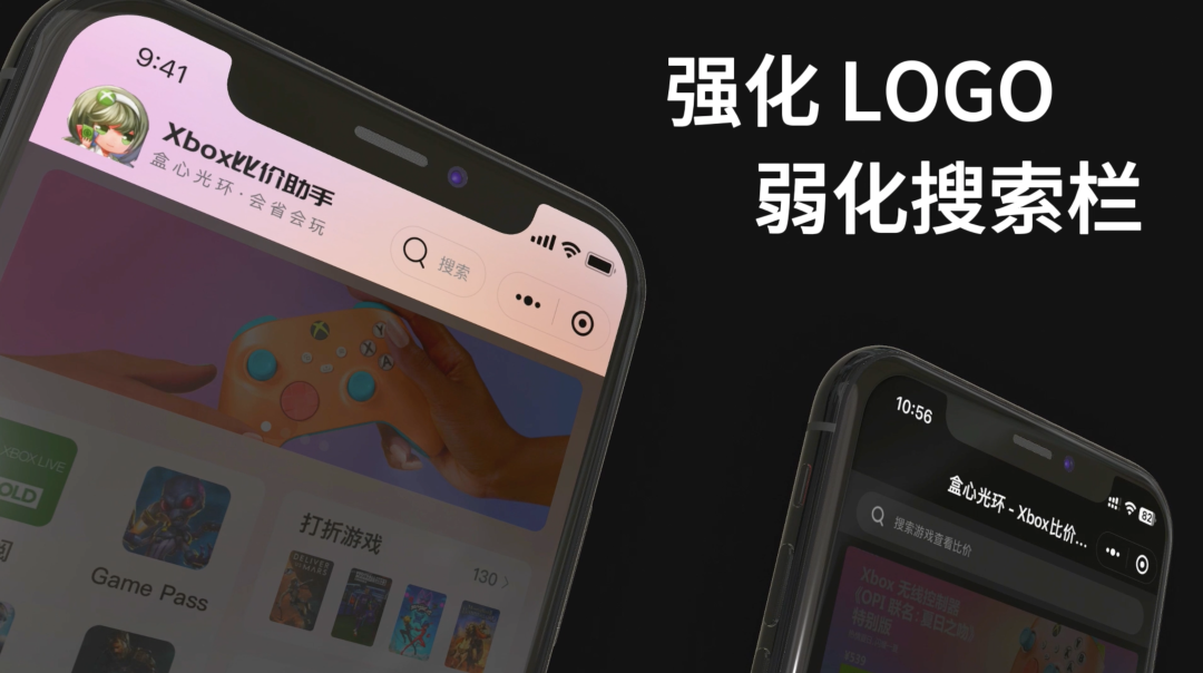 上图为顶部栏,左图为新版,强化了LOGO,弱化了搜索栏;从产品角度,我们监测运营数据发现,搜索频率不高,那就减少空间占位;新增LOGO和宣传语,进一步占领用户心智;从设计角度,搜索栏模拟小程序胶囊的样式,协调、统一、对称,并且升级为全局综合搜索的功能。