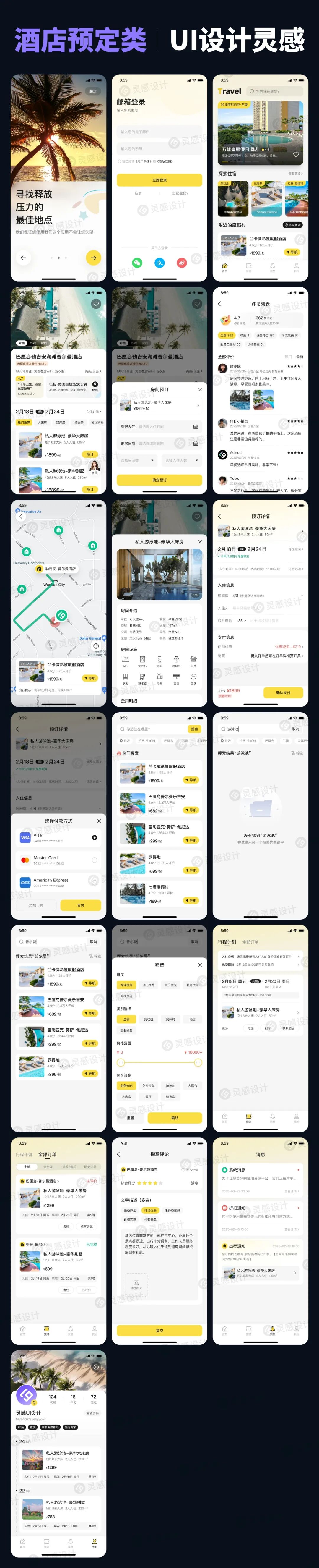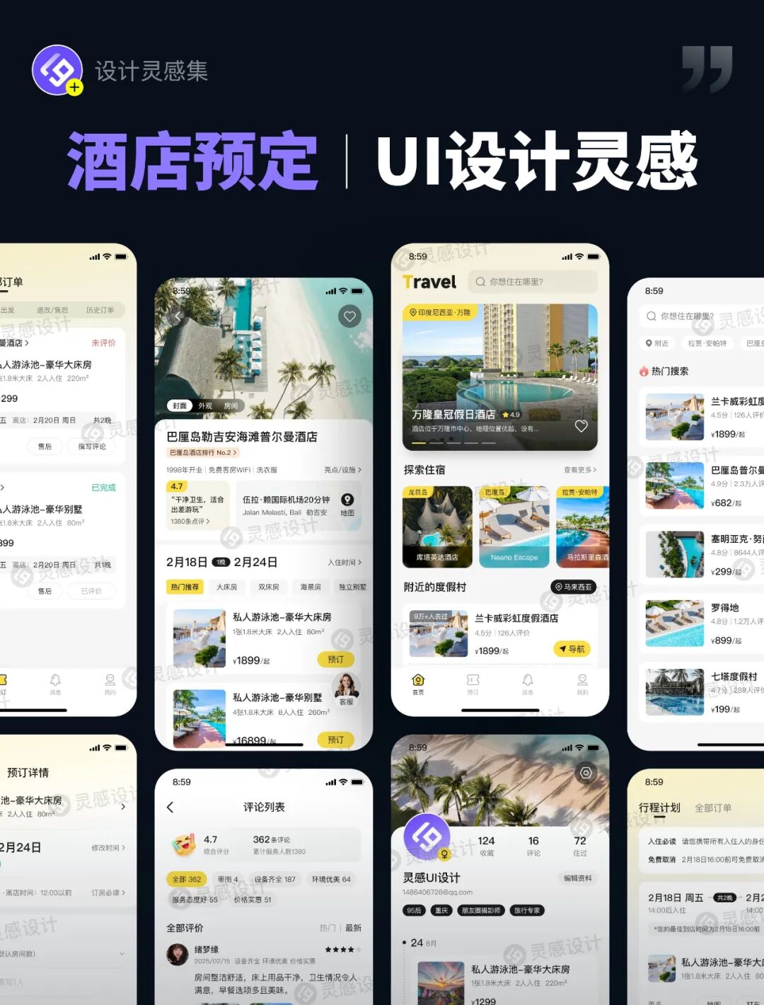 视觉氛围契合主题:以清新明亮的色调搭配高质量酒店实景图,营造出度假感与舒适感,精准契合 “酒店预定” 的场景调性。 信息层级清晰:从搜索、列表到详情、订单等页面,关键信息(价格、日期、评分、设施)排布有序,用户能快速捕捉核心内容,决策与操作路径流畅。