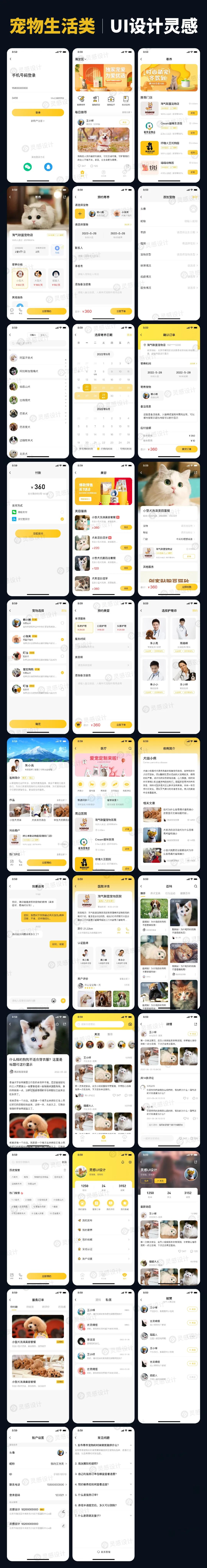 风格契合主题:以明亮温暖的黄色为主色调,搭配清新的白色基底,营造出活泼、治愈的氛围,精准契合 “宠物生活” 温馨愉悦的场景调性,易唤起用户对宠物的情感共鸣 设计统一性强:字体、按钮样式、色彩系统在各页面保持一致,提升视觉辨识度
