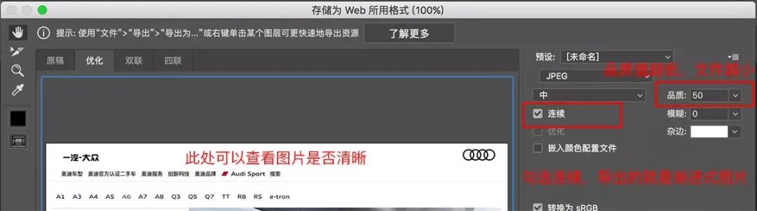 必须对图片进行压缩处理,既要文件小(每张图片不超过100mb),又要保持清晰,渐进式图片是最好的选择。渐进式图片带来的好处是——让用户还没有下载完图片,就可以看到最终图像的大致轮廓,一定程度上可以提升用户体验。