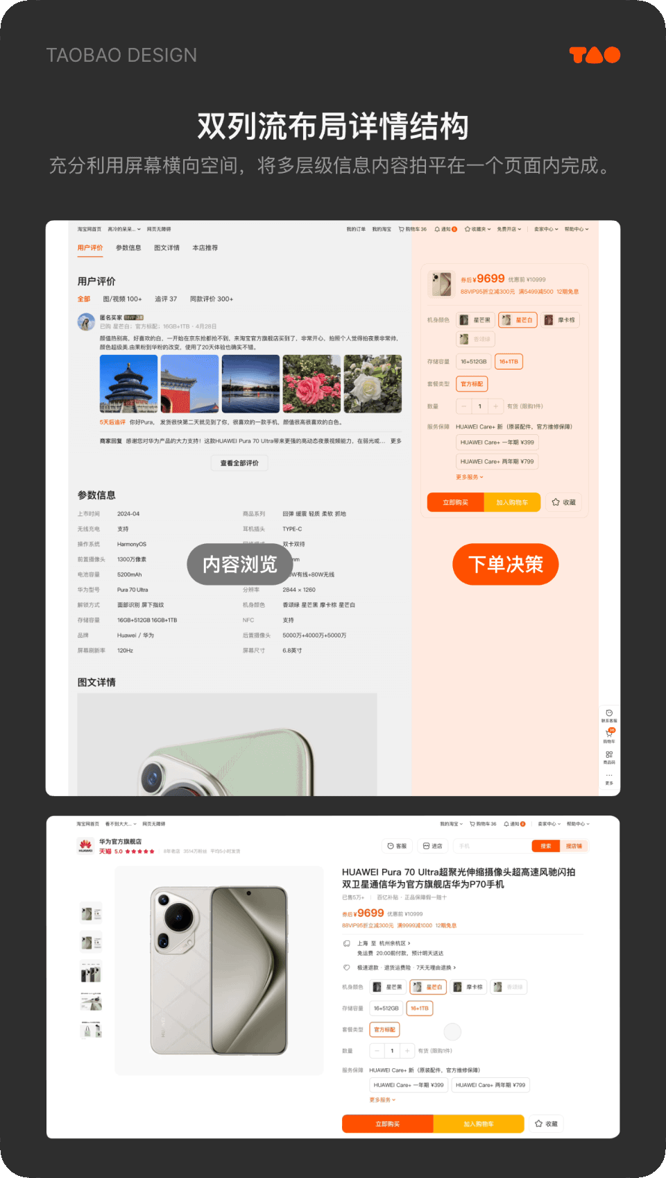 详情是用户浏览商品,选择款式,加购下单的核心页面。承载大量信息展示和操作。当屏幕横向空间扩大后,在详情布局结构上,手淘设计师也相应进行改造,形成双列流布局。