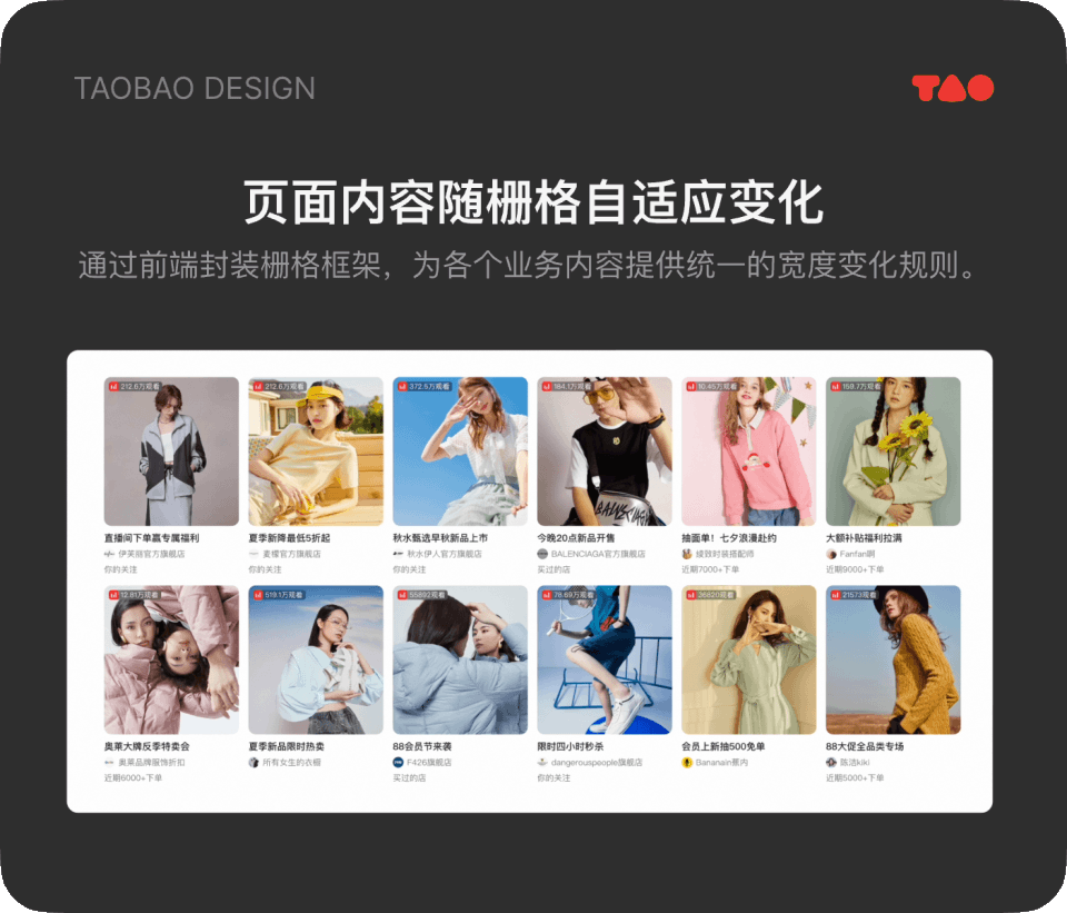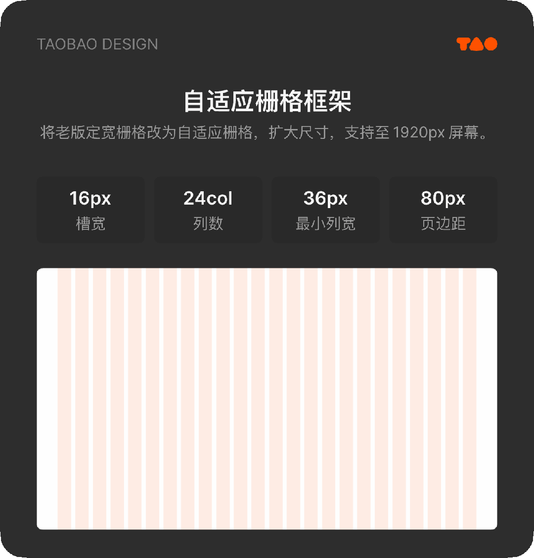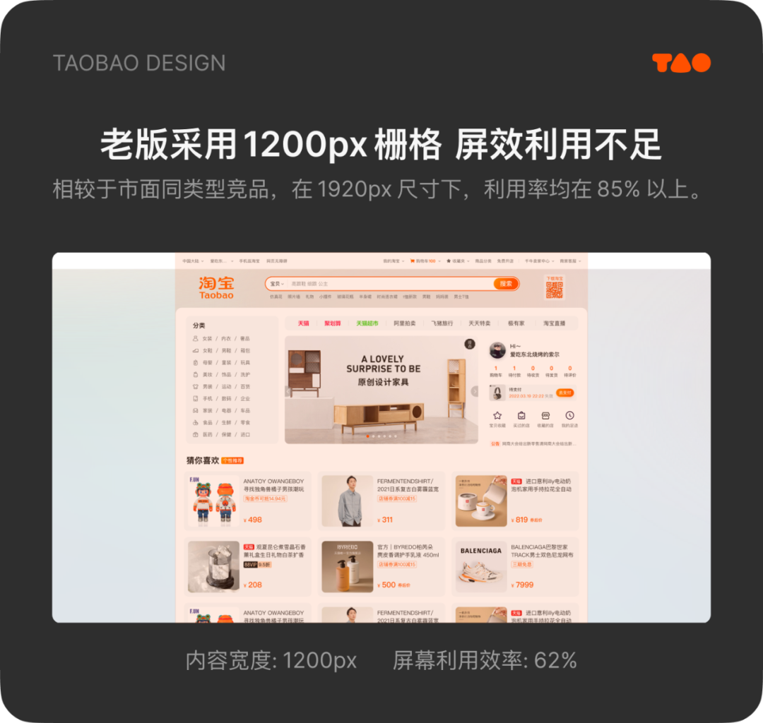 之所以存在部分用户更加喜欢使用Web端淘宝,核心在于桌面端设备相较于手机设备,能够提供更大的屏幕面积。而这也是我们这次改版核心切入点:如何利用更大的屏幕,带给用户更高效的购物体验?老版淘宝网还采用的是定宽1200px的栅格体系,使得其整体屏效仅有62%,无法满足现在用户的诉求。所以,我们首先需要构建一套桌面端栅格框架。