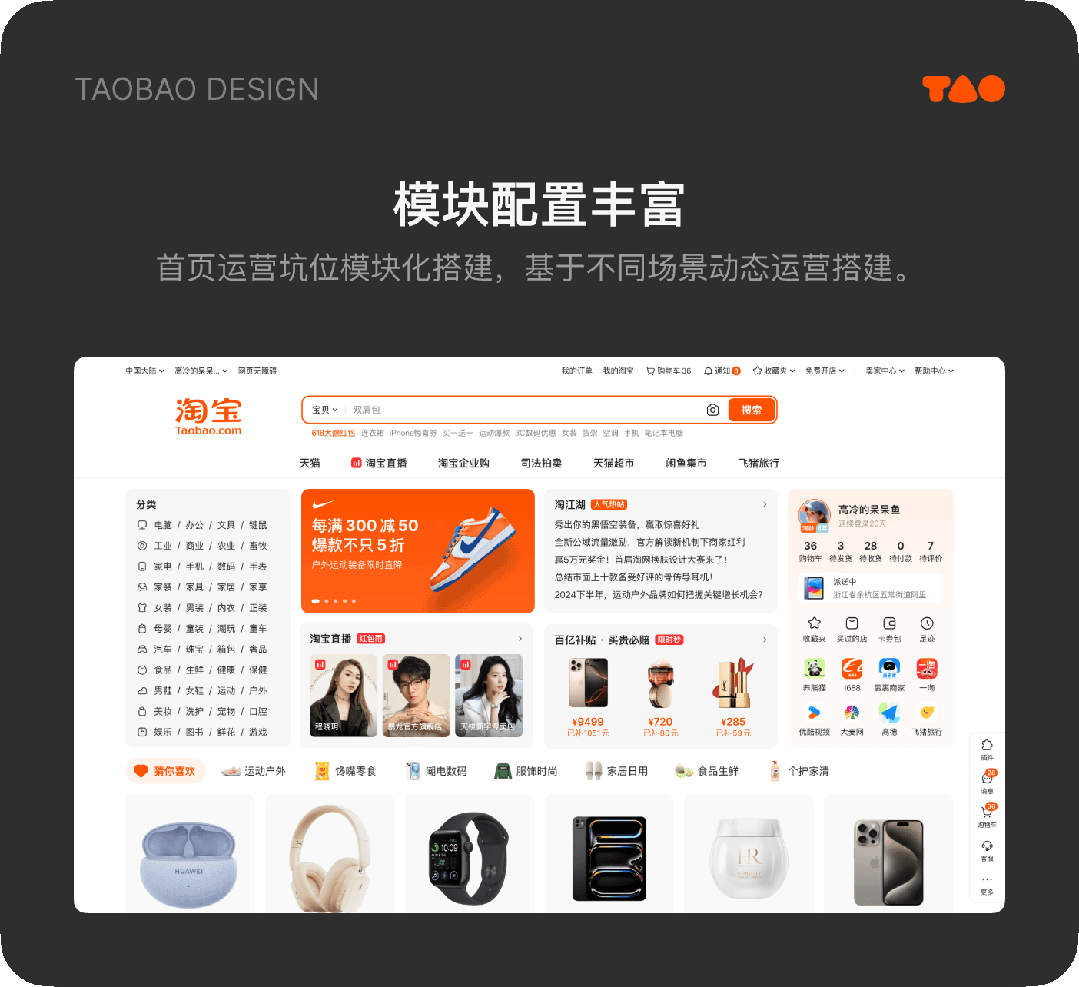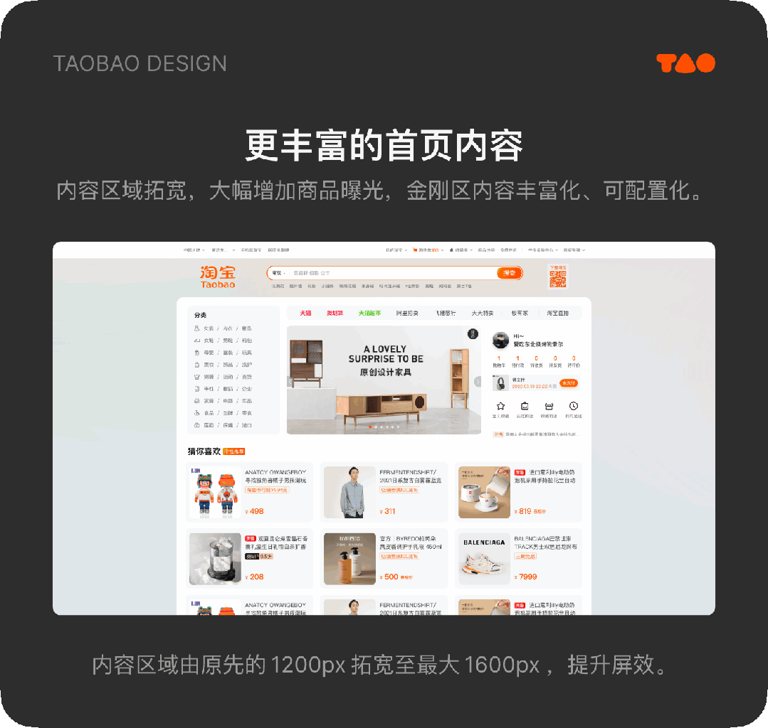 首页内容框架从1200px扩宽至1920px。扩大的内容能够放下更多商品内容。同时针对首页运营位,提供模块化搭建能力,首页将根据不同节点场景搭建对应的坑位内容。
