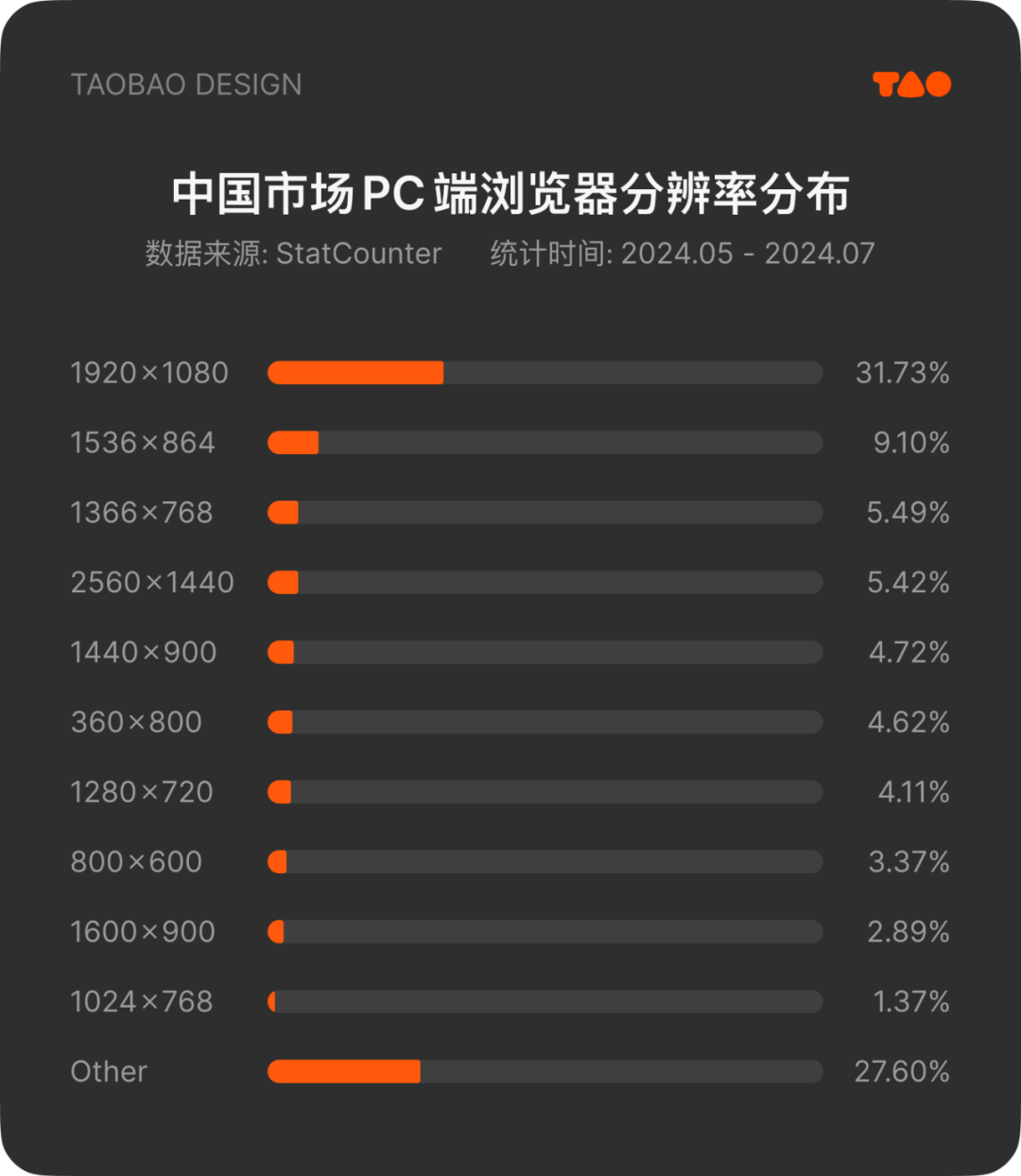 - 不同于手机设备,PC显示器分辨率集中度很低,且差异度较大,宽度从1024-2560之间均有分布。