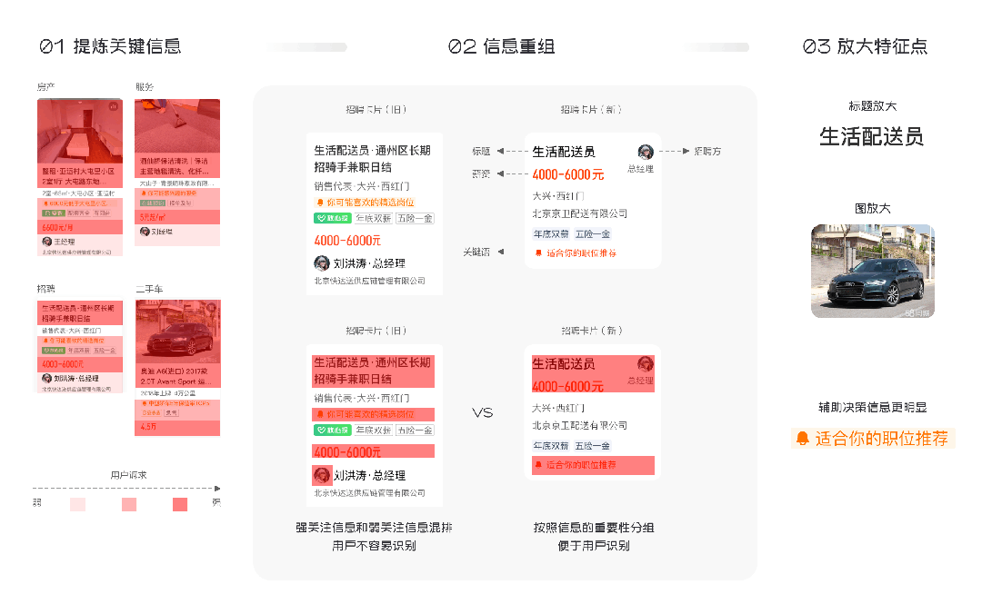 页面形态层面,我们对小卡片结构(feed卡片)、大容器框架(消息中心、个人中心)都进行了分析和重构。根据之前实验的经验,我们明确了此次改版要解决的问题:卡片信息过载,视觉流线混乱及业务卡片关键信息不明显。我们对各大类卡片关键信息进一步梳理,删减非必要信息,将来原来信息混排的方式调整为关键信息聚类的排版方式,然后放大特征点,共计8类卡片,体验和数据均有了明显的提升。