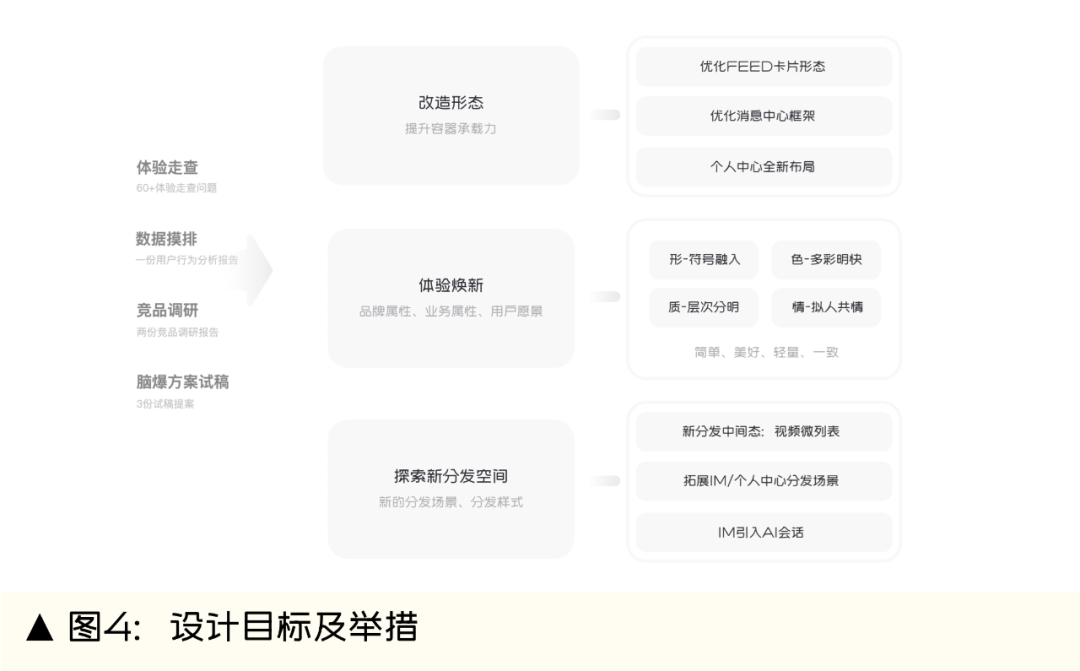 在体验走查、数据摸排等前期准备的过程中,我们认识到这三个场景页面在满足用户诉求的同时,要保证分发效率的稳定,保证内容展示效率,也就造成了之前大家不敢改,不能改的局面,但是仅通过表层的换肤,是无法达到产品易用的效果的。所以我们基于“效率”、“品牌温度”、“一致”的设计目标,以及根据前期多轮小迭代实验的结果,与业务团队共创,去制定相关的迭代计划。1、改造形态:致力于让用户更好找、更容易决策,同时承担业务分发信息的诉求。