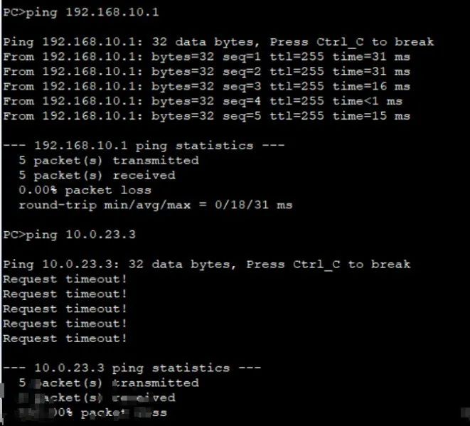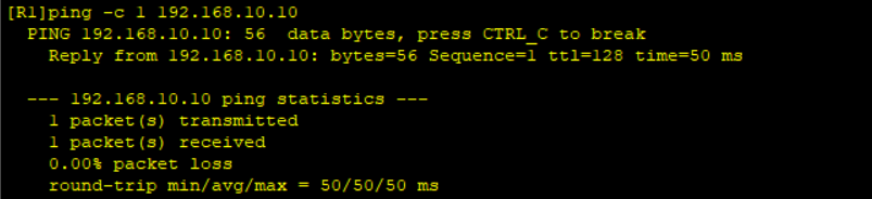 按照上面的操作,现在已实现主机1和主机2之间的互通。若假设现在的网络出现了故障,主机1一侧的网络管理员发现无法正常的与主机2通信,于是先测试与网关设备R1和R3的连通性。