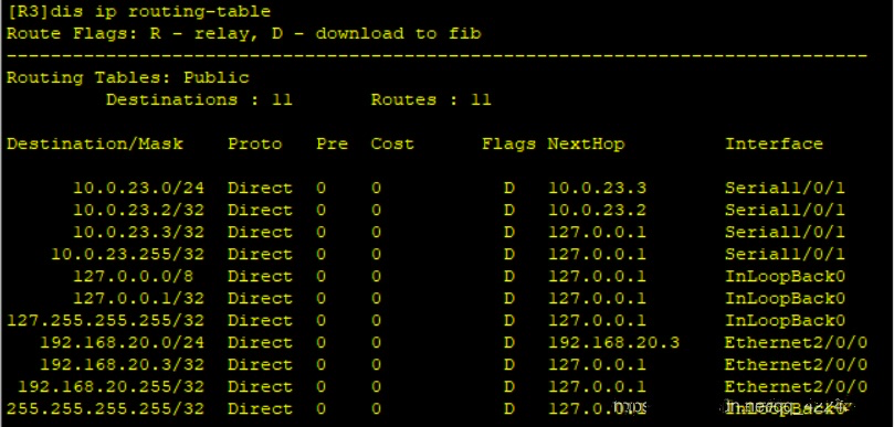 通过路由表上显示的信息,可以看到路由表上没有关于主机2所在网段的信息,同样可以使用相同的方法查看路由器R2和R3上的路由表信息。