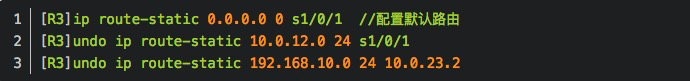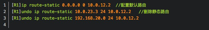 现在,在R1上配置一条默认路由,即目的网段和掩码都是0,表示任何网络,下一跳为10.0.12.2,并删除先前配置的两条静态路由。