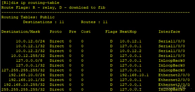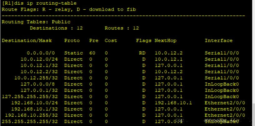 可以看出主机与网关之间的连通性正常,接下来检查网关设备与R1上的路由表:使用 display ip routing-table 命令。