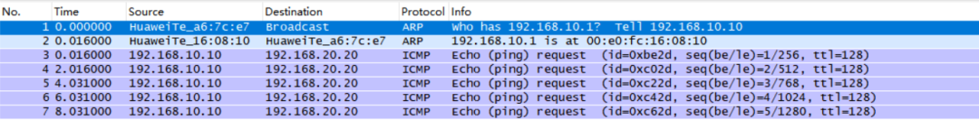 发现,两台主机之间仍然无法正常互通。在主机1上的E0/0/1接口上进行数据抓包,观察现象: