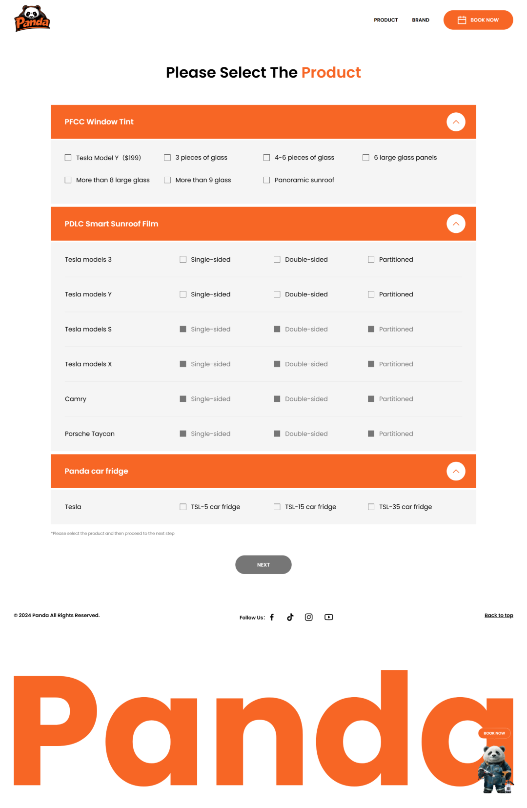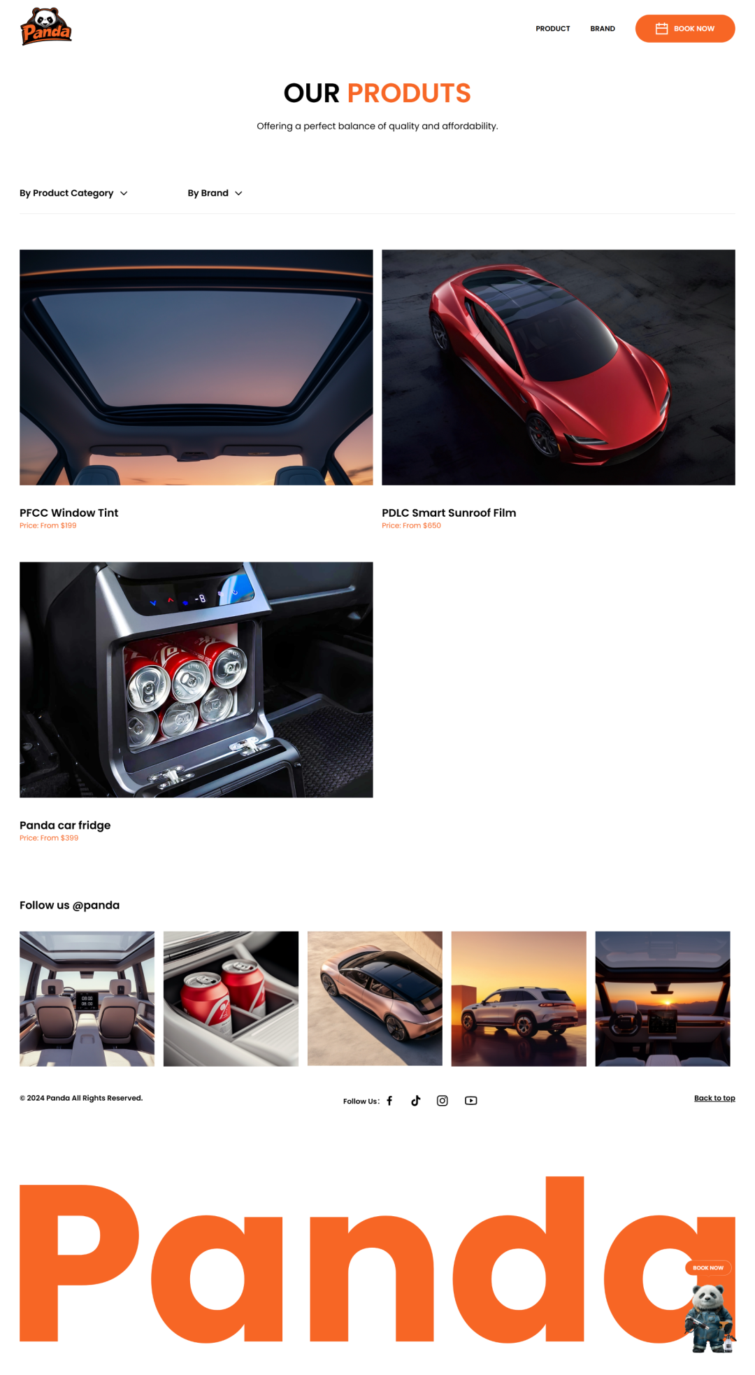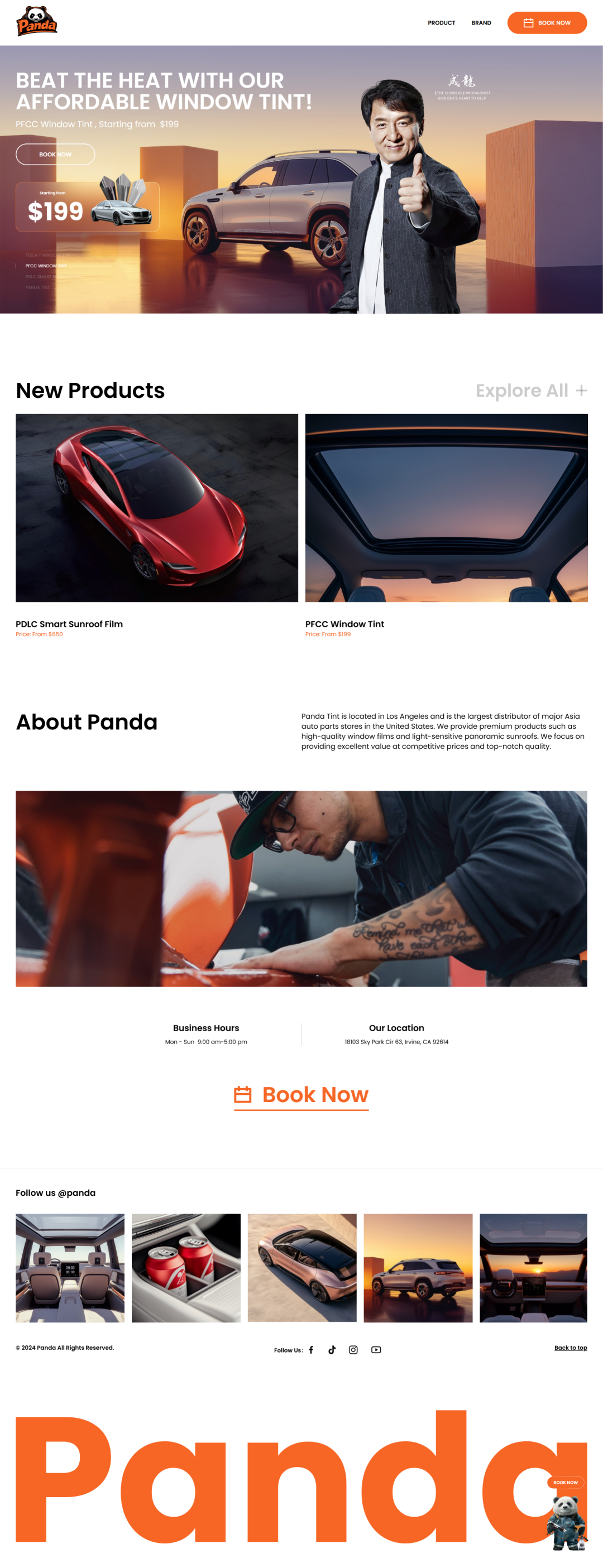 Panda Tint is located in Los Angeles and is the largest distributor of major Asia auto parts stores in the United States. We provide premium products such as high-quality window films and light-sensitive panoramic sunroofs. We focus on providing excellent value at competitive prices and top-notch quality.客户是在洛杉矶卖汽车配件的,目前的产品针对特斯拉为主,包括天幕、玻璃膜和冰箱。加州的天气很热,而且特斯拉的全景天窗完全不隔热,这也不是特斯拉的问题,是所有电车的问题,所以一般电车还得需要考虑加隔热玻璃膜。目前客户代理的品牌在国内是专做全景天幕,价格在3000到6000左右,我们进的是5000左右的那档价位,产品完全不盈利,主要是收点安装费,因为这款产品安装门槛很高,他们是全美的代理。这个官网从设计到上线估计花了1个多月的时间,简直是火箭速度,主要是客户的信任,全权交给我们制作,除了准确性的问题,风格性问题完全不管!感谢客户的支持和信任!首页: