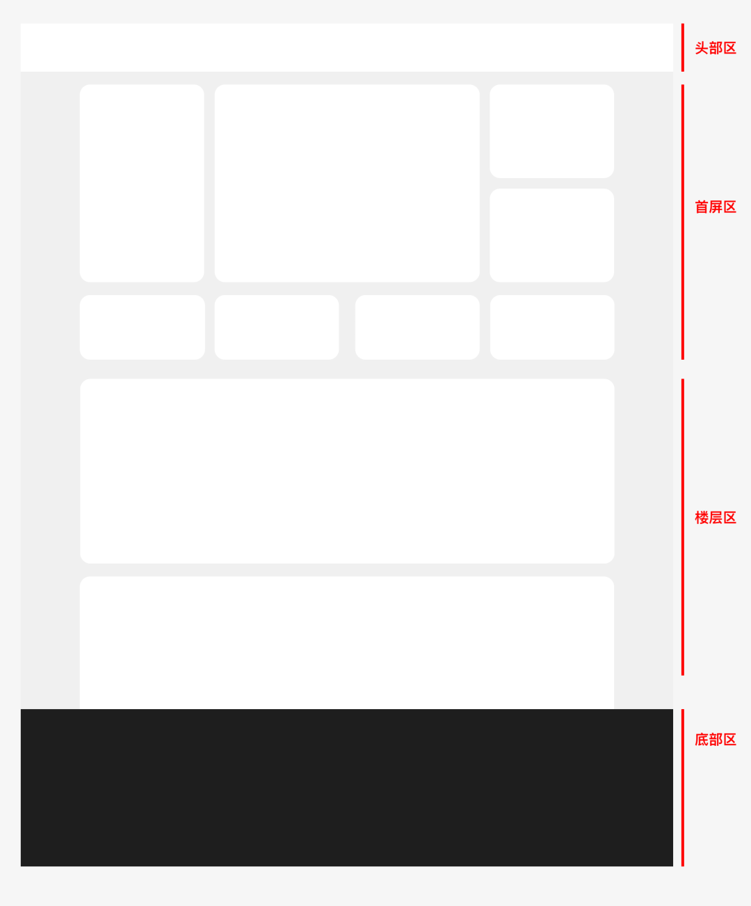 整体框架与多数网站一样, 自上而下分为头部区、内容区、底部区。内容区又划分为了首屏区和楼层区两大模块,以用户需求的优先级进行内容布局,