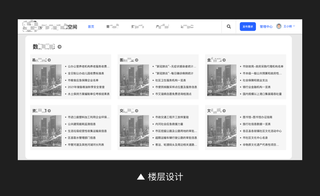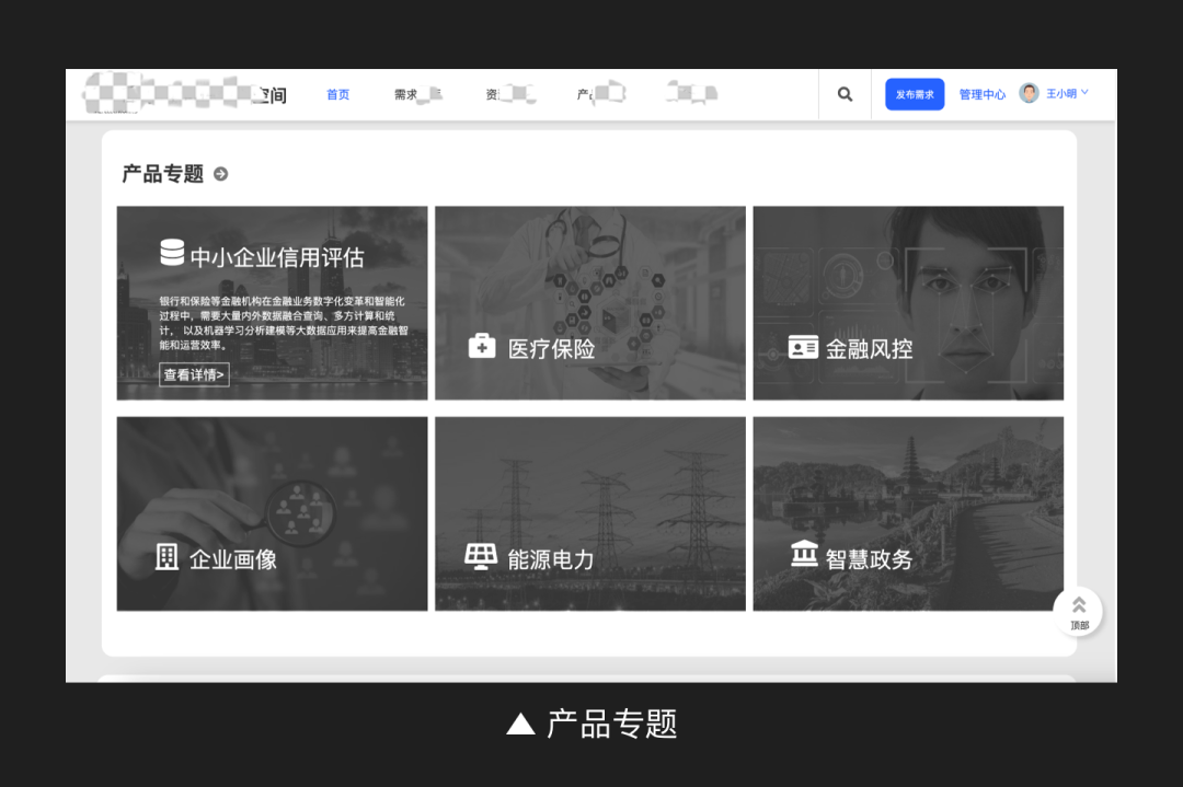楼层是常见的展示方式,有利于内容聚焦、增强信息层次和秩序,并且相互独立的楼层空间方便内容的扩展。另外首页汇集了全平台的信息,页面会比较长。多屏空间下,客户的浏览量会逐步降低。结合楼层锚点,用户可以快速了解整个页面内容、定位目标楼层,增强底部楼层曝光几率。用户行为目标是具体的数据需求、数据资源和数据产品,因此需要通过各种设计策略构建用户与内容的连接通道。未来,平台会聚集成千上万的开发商和产品,搜索就成为连接用户和各类数据产品非常重要的方式。受限于框架形式,搜索功能仅以icon形式展示,视觉效果并不突出。于是我们进行了适当的优化,在首页Banner区增加了搜索功能。另外在产品列表页面,除了固有的产品分类,我们还增加了分类下的搜索关键词,便于用户直接发起产品搜索。B端产品是为了解决用户问题而存在的,用户必然是在一定的场景下,才会使用B端产品。由于门槛所限,用户可能会出现不知道该搜索具体产品的场景,只能不断的试错,但是用户对自己的应用场景是明确的。为了解决该场景下用户的需求,我们增加了产品专题楼层,通过用户熟悉的“应用场景”作为连接纽带,拓展用户与产品的连接渠道。同时产品专题聚合了一类数据产品,方便用户集中快速查看,用户效率更高。