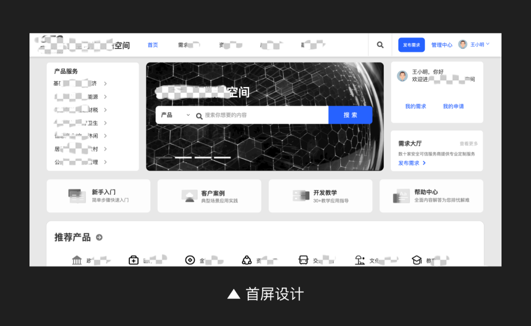 考虑到产品定位以数据产品的交易撮合为目标,数据产品作为平台核心信息,需要强化曝光。为了更高效地利用屏幕空间,首屏信息采用了紧凑型的设计方案。划分为三个功能区,包含了左侧数据产品列表,中间运营搜索区以及右侧辅助模块等内容。