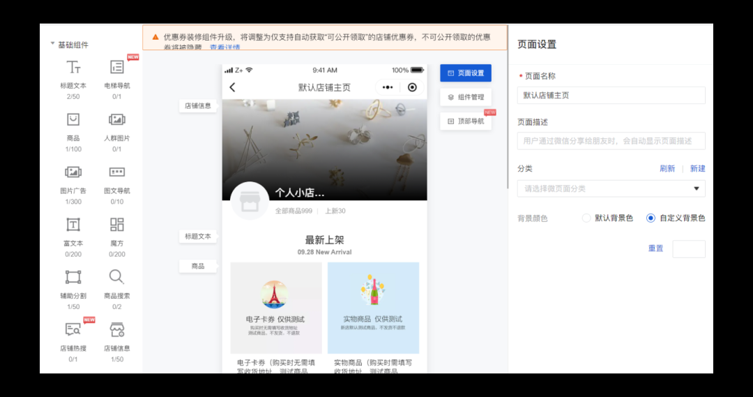有赞商家管理平台中,店铺装修模块将元素组件化,用户拖拽就可以快速搭建店铺,将装修效果直观的展现给商家,并且可以预览手机端和PC端的展示效果。