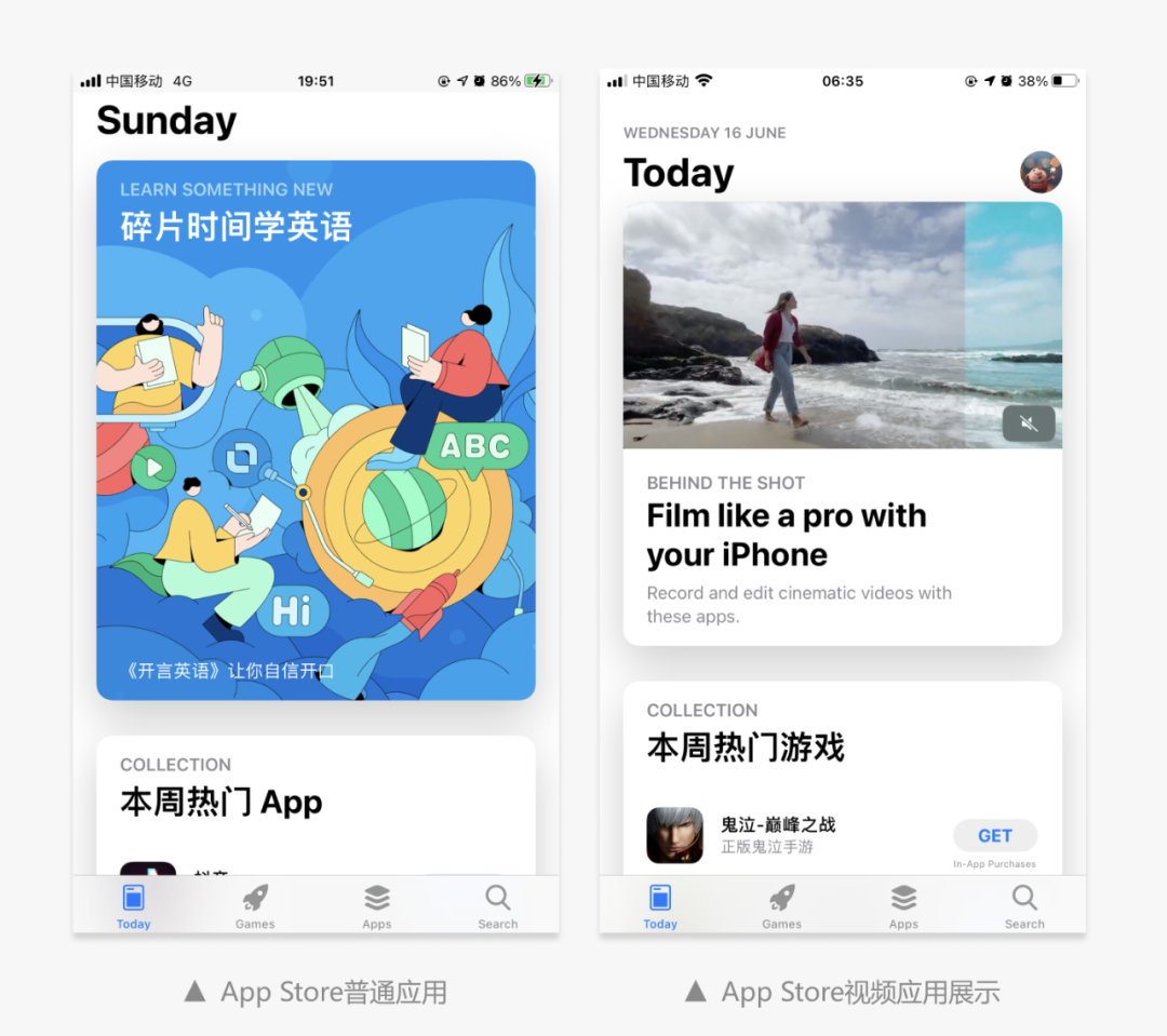 微信读书“发现”页面以书籍推荐为主,采用了少而精的策略,每次推荐1本或6本,通过“换一批”功能扩展推荐数量。下方则是利用社交关系和从众心理为用户推荐书籍卡片以及运营活动坑位。整体而言,微信读书发现页面属于内容相对简单的场景。App Store“今日”页面是展示了近一周的应用推荐,每天包含了6个大卡片,内容相对固定,包括主推应用、App榜单等。除了图片之外,大卡片中还可以嵌入视频增强App的表现力,让用户可以更好的了解App。