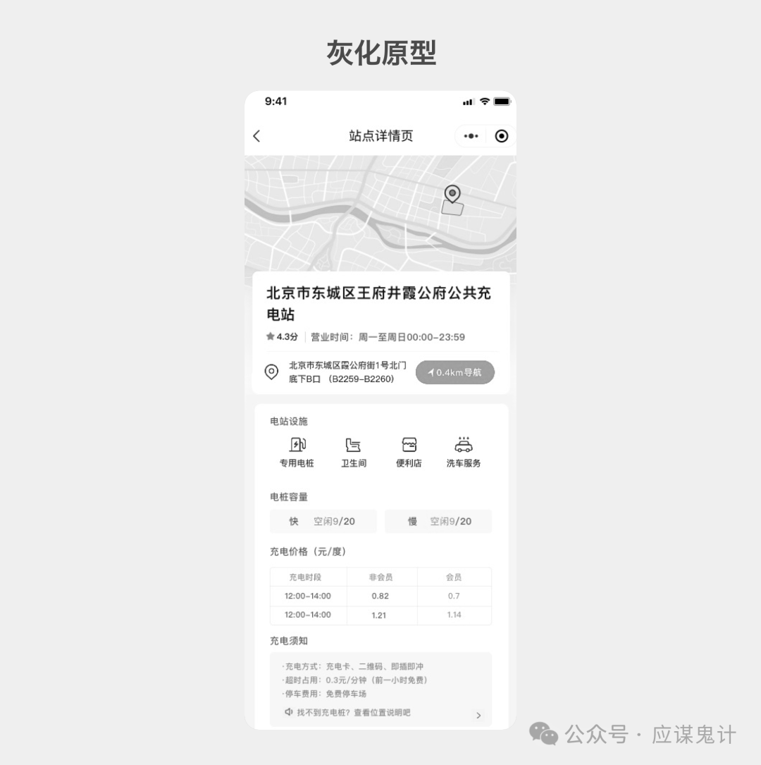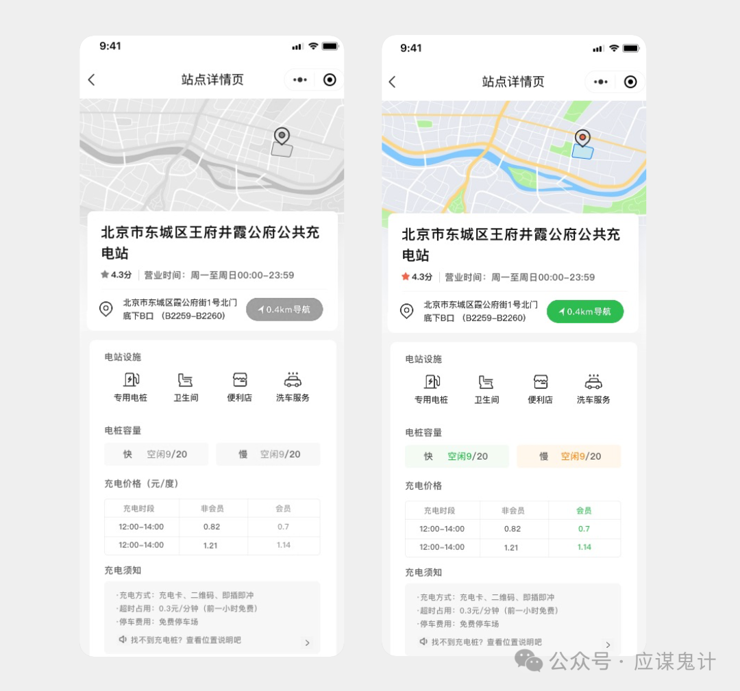 所以在一个界面中95%的文字都只需要利用好黑、深灰、灰,或者黑、灰这样2-3个层级的文字颜色即可。那什么地方需要上颜色呢?上色的地方不管是业务侧还是用户侧,只要是需要用户强关注、强利益点、强任务引导、强激活、强警示信息都需要上色,但是哪些是强,哪些是弱,需要设计师对业务和用户有的一定的了解才能分辨出来。拿上方的例子看,有哪些是5强信息:1.充电站评分 2、导航和距离按钮 3.充电桩当前状态和数量 4.充电的会员价格