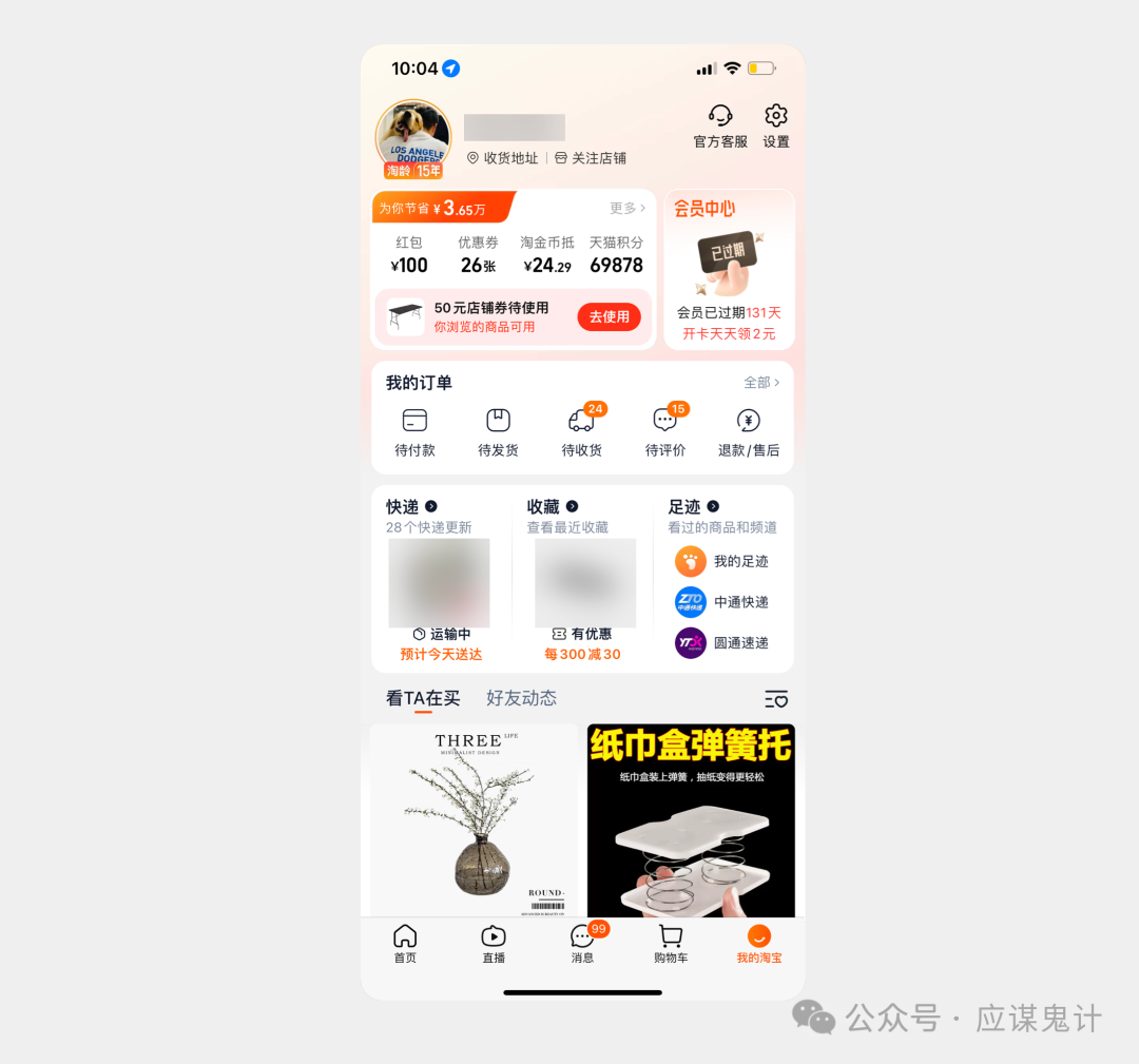 再拿一个淘宝的个人中心举例,再来分析一下哪些是5强信息:1.淘龄 2.节省金额 3.优惠券信息 4.会员中心信息 5.订单当前数量 6.收藏优惠、降价信息 7.今日送达物流信息 8当前激活的标签。