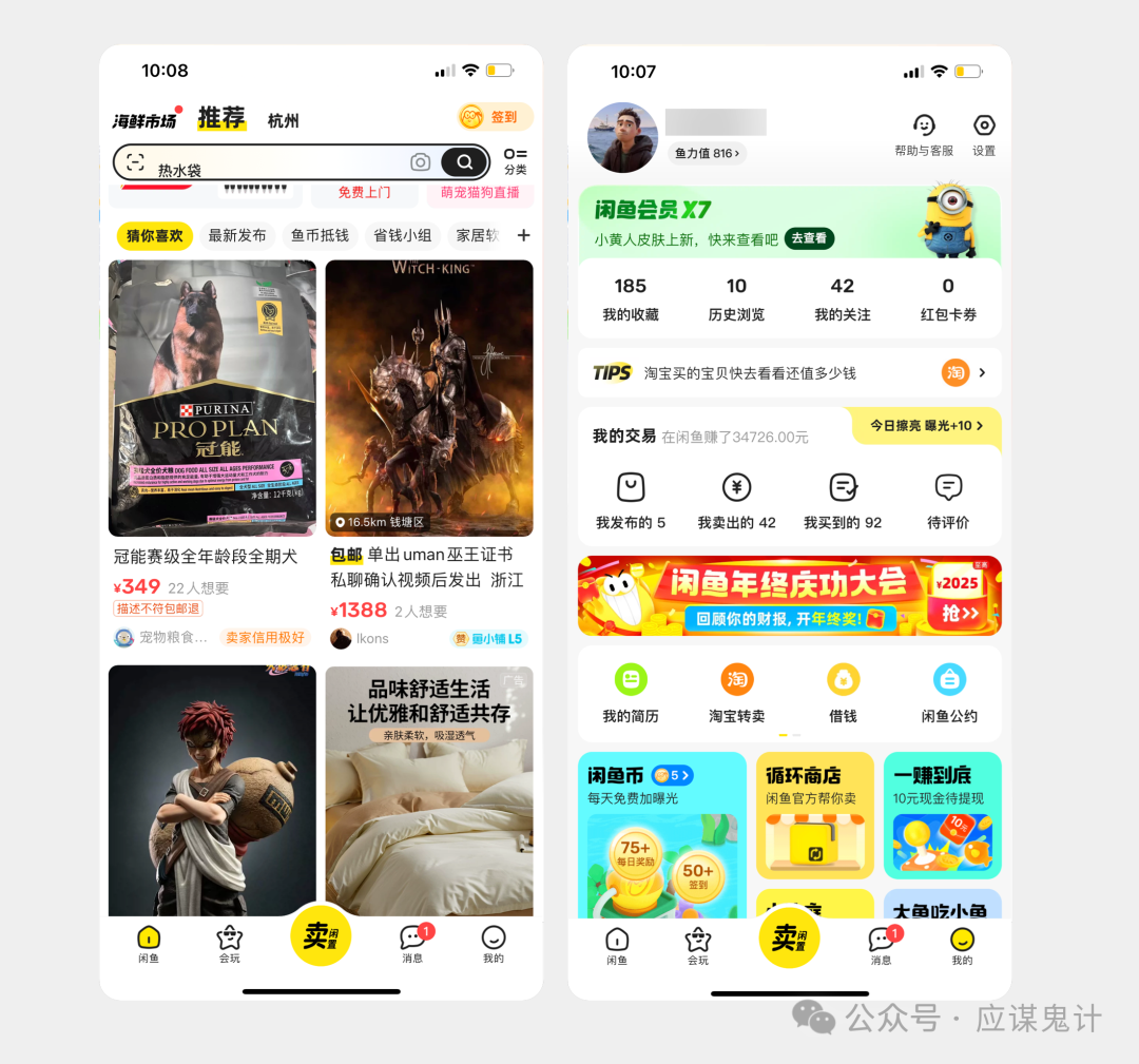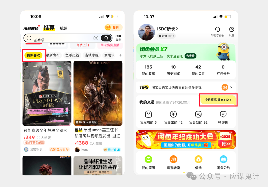 一个很核心的原则,除最高优先级点击转化的按钮外,尽量不使用色块上色,如特别需要色块做布局那么也尽量用弱化的形式去表现。例如闲鱼的卖闲置大按钮、今日擦亮曝光,这里我们还能发现两个细节,一个是首页上的tab,为什么只是一个tab也做成了色块按钮,因为上下都是图片+卡片,如果不做成色块按钮,这里的信息就会非常弱,另一个在视觉上也会造成腰斩的感觉。第二个是个人中心的擦亮曝光按钮,这里并没有用主色调,而是用了一个低饱和的黄色,也是考虑到个人中心的用户需求不需要太强烈的引导,如果哪天业务说,我就要提高用户对擦亮的关注度,那么这里的样式甚至都可能要改变了。