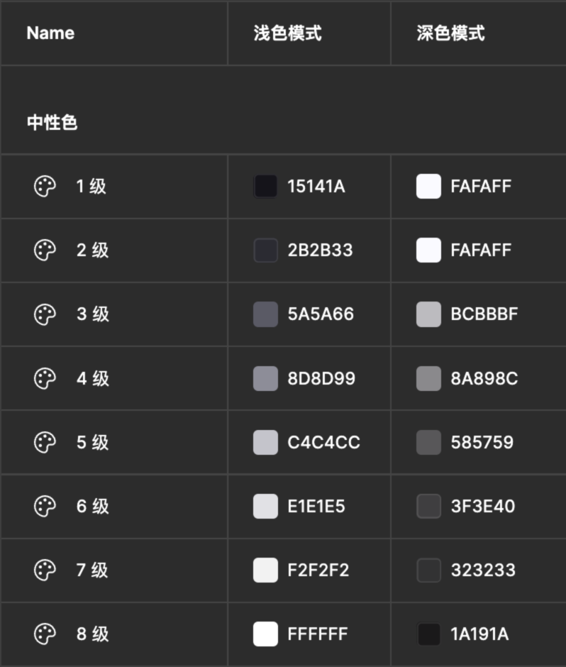 - 中性色和浅色模式对调,但在深色模式下的中性色数量要精简