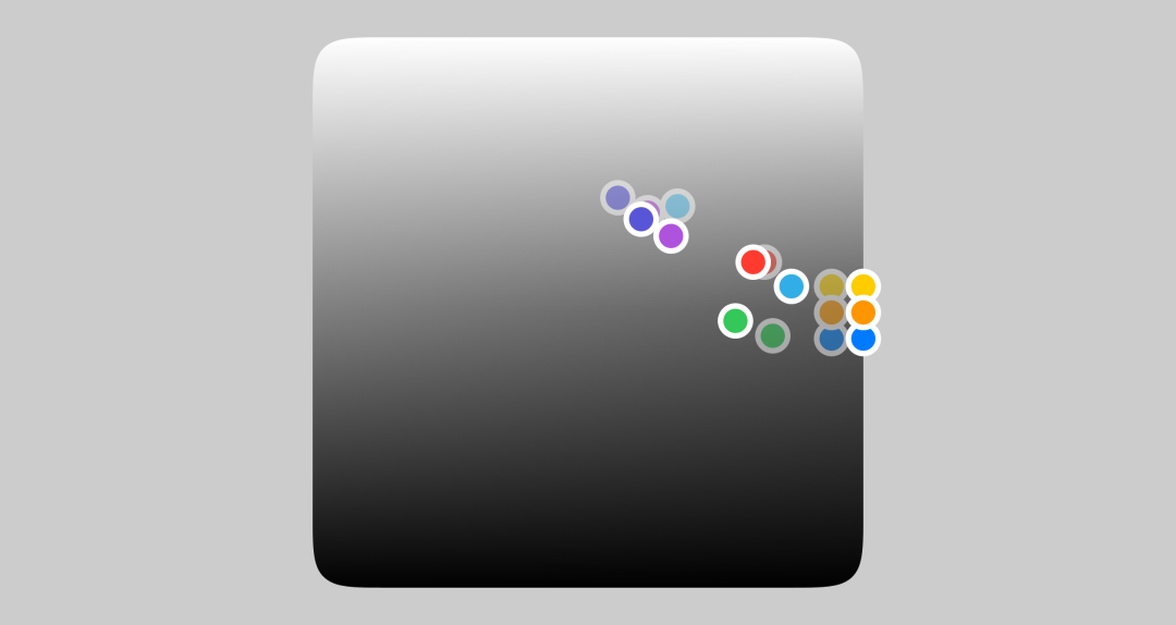 iOS 默认应用了一套系统色彩,在深色模式中,虽然还是使用这些色相但轻微调整了明度和饱和度。因为相同颜色在浅色和深色背景中给人带来的感受是不同的,所以要获得一致的色彩体验,就要在深色模式下做出调整。