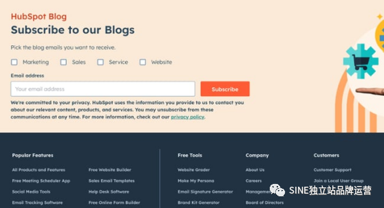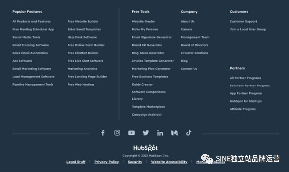 销售特定产品线的企业(例如SaaS公司)将受益于“产品”页脚。本质上,用户看到的第一个链接是产品及其功能,如HubSpot的页脚,如上图所示。公司链接和其他页面通常列在此类页脚的最后,或者有时根本不列。
