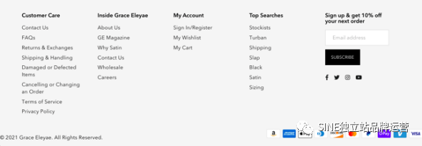 第一种方法称为创建“站点地图页脚”。这些页脚包含的导航点无法完全融入大型网站的顶级或全局导航栏,或者鼓励访客浏览网站的导航点。例如,Grace Eleyae上的站点地图页脚包含访客在首次进入站点时可能没有考虑但想要探索的导航链接。